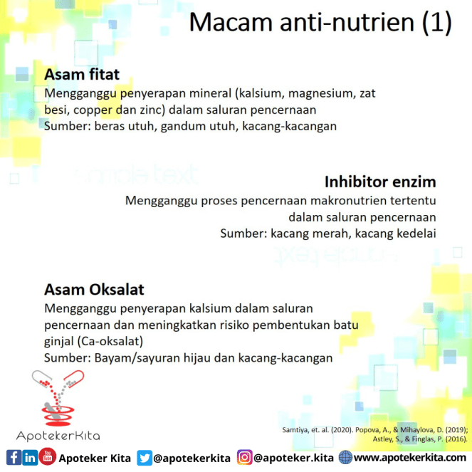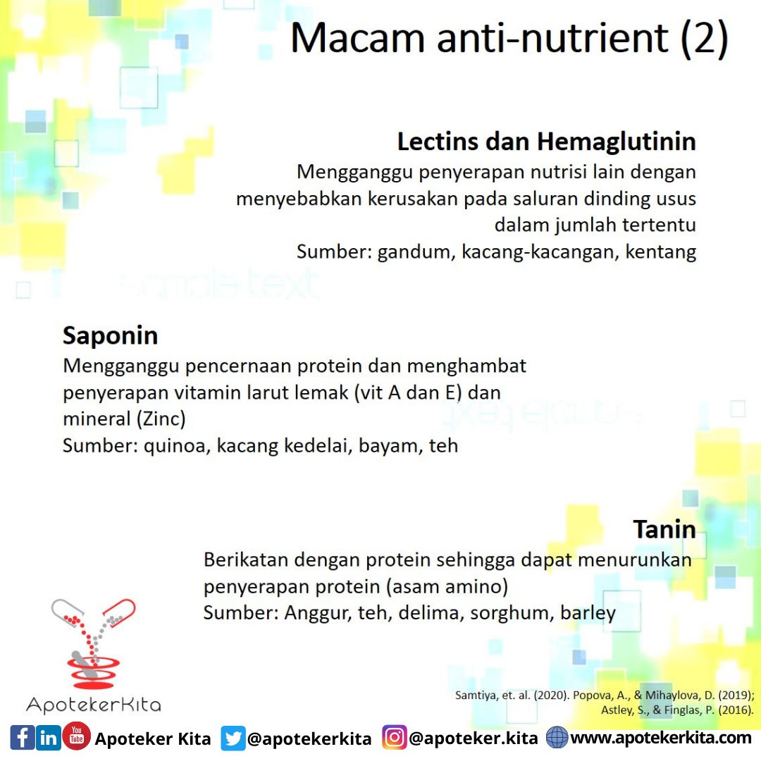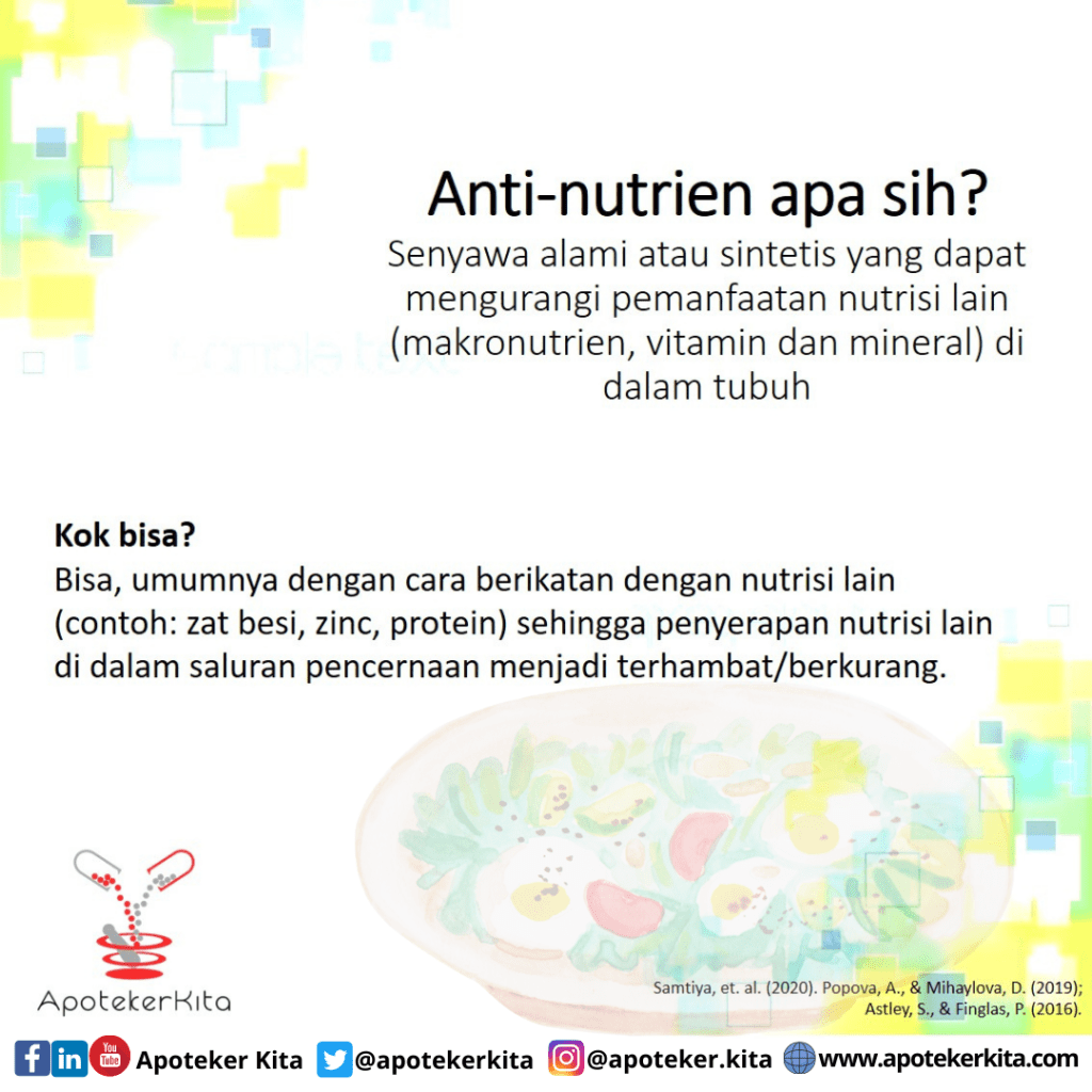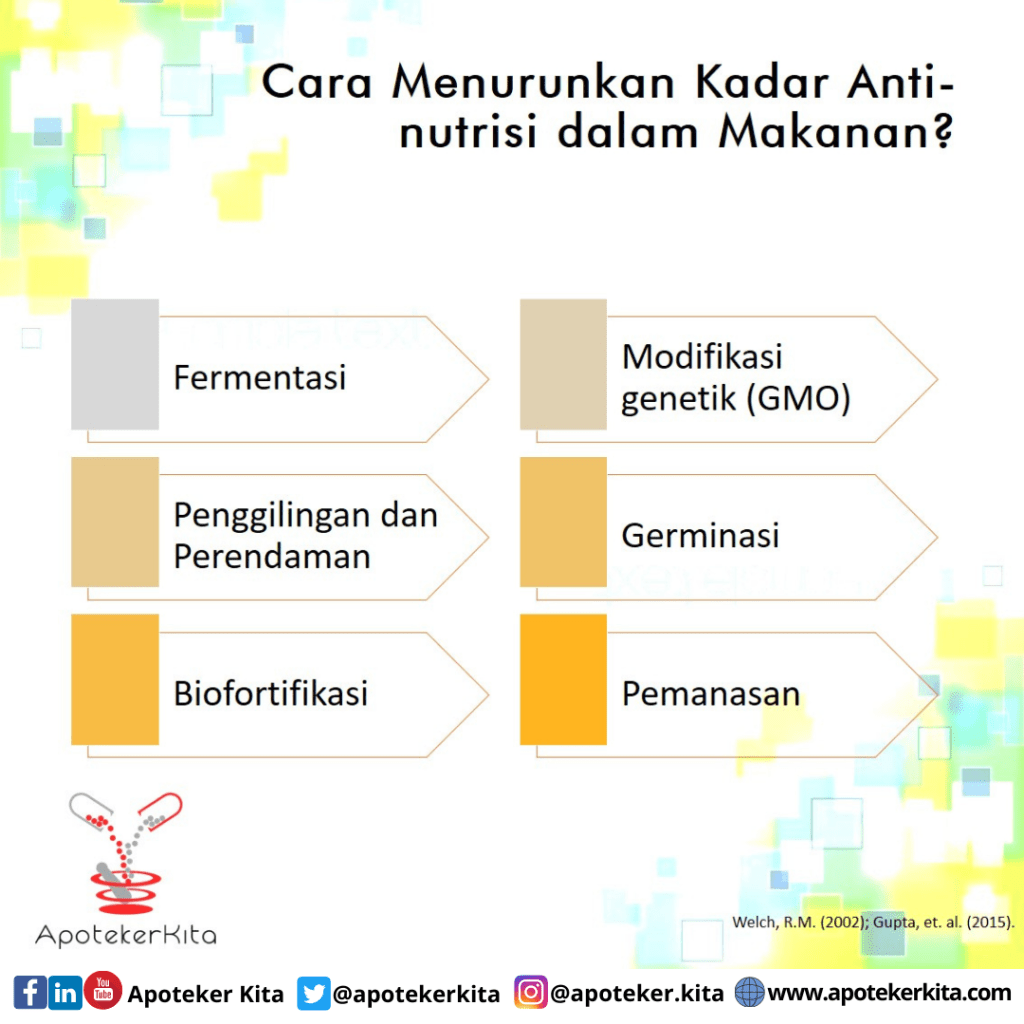 Keberadaan Anti-Nutrien pada (umumnya) tumbuh-tumbuhan, bisa bersifat merugikan bahkan berbahaya (pada kondisi tertentu) bagi kesehatan. TAPI, hal ini bisa diatasi dengan berbagai macam SOLUSI, seperti: fermentasi, penggilingan & perendaman, biofortifikasi, modifikasi genetik, germinasi, dan pemanasan.