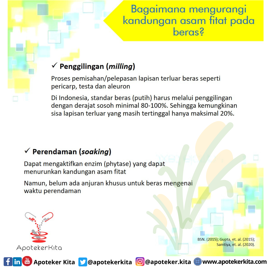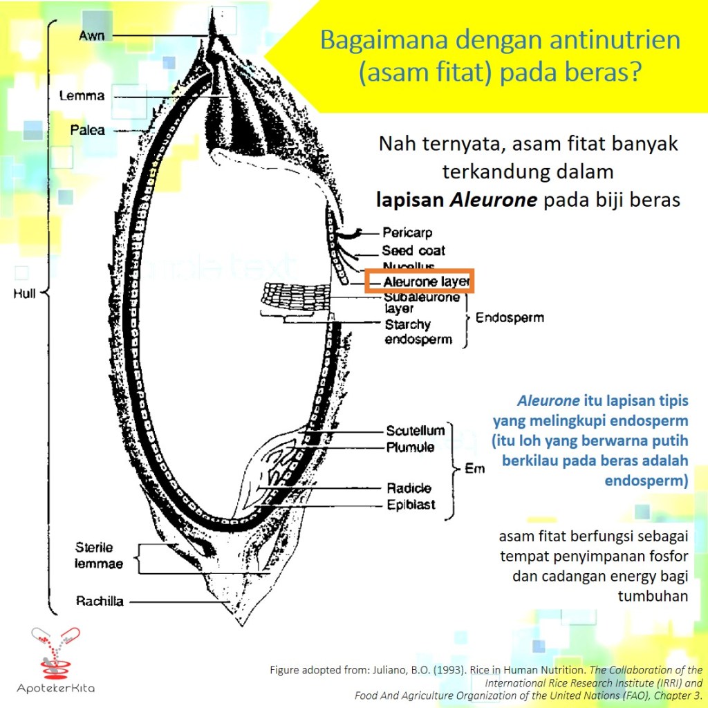 Asam Fitat terletak di lapisan luar pada beras. Nah, beras putih yang terstandar hanya memiliki maks 20% sisa lapisan luar setelah melalui penggilingan (milling).