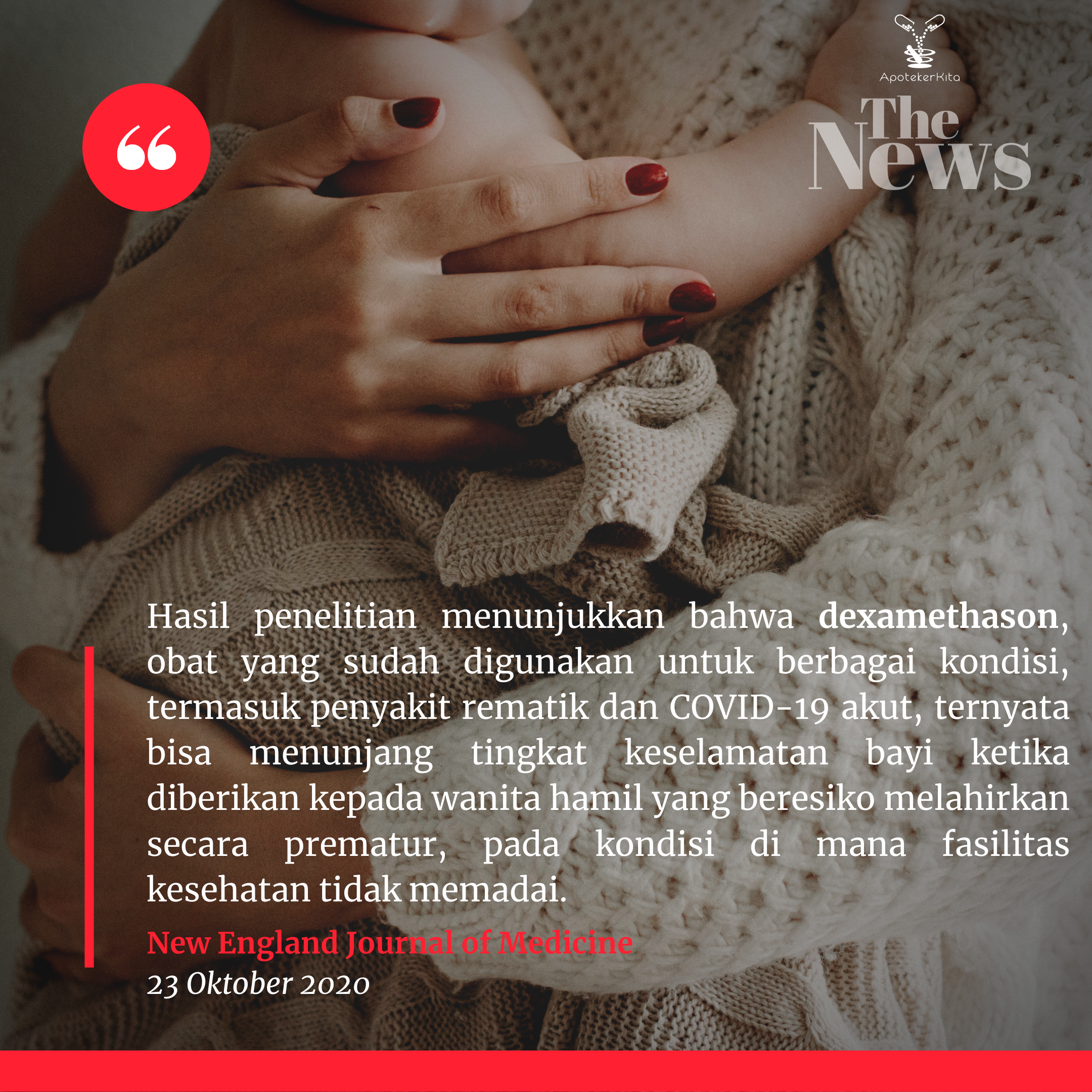 Kabar baik datang dari hasil penelitian yang diterbitkan oleh New England Journal of Medicine pada tanggal 23 Oktober 2020, disebutkan bahwa dexamethasone – obat yang sudah digunakan untuk berbagai kondisi, termasuk penyakit rematik dan COVID-19 – ternyata bisa menunjang tingkat keselamatan bayi ketika diberikan kepada wanita hamil yang beresiko melahirkan secara prematur, pada kondisi di mana fasilitas kesehatan tidak memadai. Pengaruhnya sangat signifikan, dari 25 wanita hamil yang diobati dengan dexamethasone, 1 kelahiran bayi prematur terselamatkan. Ketika obat ini diberikan kepada wanita hamil, dexamethasone akan melewati plasenta dan membantu percepatan pematangan paru-paru bayi, meminimalisasi bayi-bayi prematur mengalami problem pada pernapasannya ketika baru lahir.